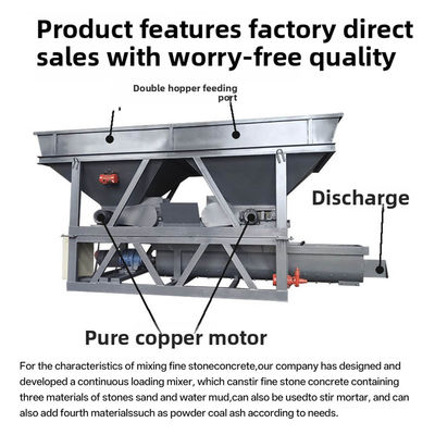 For the characteristics of mixing fine stoneconcrete,our company has designed anddeveloped a continuous loading mixer, which canstir fine stone concrete containing three materialsof stones,sand and water mud,can also be usedto stir mortar, and can also add fourth materialssuch as powder coal ash according to needs.