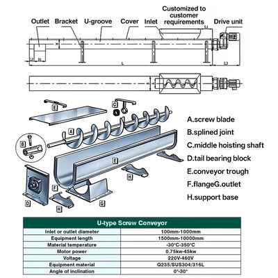 Özel paslanmaz çelik ve karbon çeliklerden oluşan U tipi oklu çamur vida taşıyıcıları ve endüstriyel uygulamalar için paslanmaz çeliklerden oluşan oksuz taşıyıcılar üreticisi.